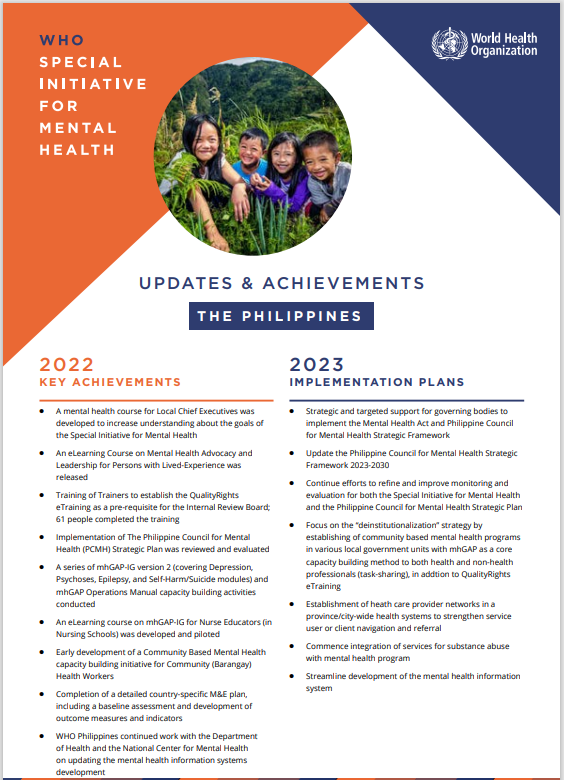 WHO Special Initiative for Mental Health: Philippines. Retrieved from https://www.who.int/initiatives/who-special-initiative-for-mental-health/philippines : Mental Health Program